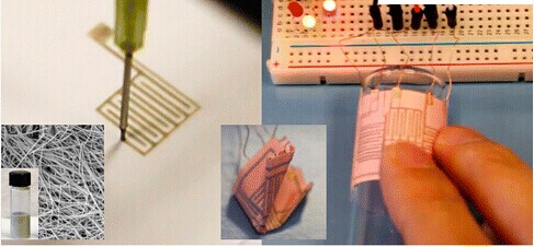 Anming Hu教授及其同事指出,因?yàn)榧垙堅(jiān)谑澜绶秶鷥?nèi)易于獲取,價(jià)格低廉,使其成為輕微的、可折疊的電子元件的極佳載體,而且?guī)缀蹩梢栽谌魏蔚胤街圃?,在任何地方使用。其?shí)之前,科學(xué)家就已經(jīng)制造出了基于紙張的即時(shí)診斷工具和便攜的DNA檢測(cè)器。但是,這些儀器需要既復(fù)雜又昂貴的制造技術(shù)。銀質(zhì)的納米線墨水高度導(dǎo)電而且穩(wěn)定,提供了一個(gè)更實(shí)際的解決方案。Hu教授和他們團(tuán)隊(duì)希望研發(fā)出一種技術(shù),直接把金屬墨水打印到紙面來制作傳感器,而這樣的傳感器又可以對(duì)碰觸或者諸如葡萄糖等特定分子作出回應(yīng)。