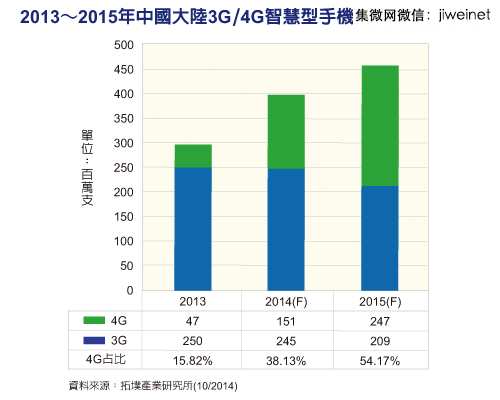 市場研究機構(gòu)拓墣產(chǎn)業(yè)研究所指出,隨著4G服務(wù)開通與4G晶片價格快速下滑,中大陸市場4G手機出貨量正強勁增長,預(yù)估2014年可達一億五千一百萬支;2015年更將正式超越3G手機出貨量,達到二億四千七百萬支規(guī)模,并占整體中智慧手機出貨量54.17%。