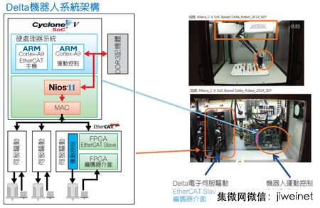 目前市場(chǎng)上比較少見(jiàn)使用單晶片來(lái)實(shí)現(xiàn)工業(yè)機(jī)器人的主機(jī)控制。從圖中的系統(tǒng)架構(gòu)圖可以看到,在主晶片Cyclone V SoC中,雙核心Cortex A9中有一個(gè)核心作為運(yùn)動(dòng)控制,另一個(gè)核心用來(lái)執(zhí)行EtherCAT主機(jī)。雙核心各自負(fù)責(zé)自己的功能,運(yùn)動(dòng)控制功能主要執(zhí)行機(jī)器人3只手臂的協(xié)調(diào)工作,演算法都放在ARM核心。FPGA主要用來(lái)執(zhí)行Nios軟核心功能。透過(guò)FPGA中的MAC連接3個(gè)伺服驅(qū)動(dòng)器。據(jù)江允貴透露,參考設(shè)計(jì)中的伺服驅(qū)動(dòng)來(lái)自臺(tái)達(dá)電子(Delta)。每個(gè)伺服驅(qū)動(dòng)中都有一個(gè)FPGA用來(lái)做EtherCAT介面。目前伺服驅(qū)動(dòng)中的演算法還是透過(guò)DSP來(lái)實(shí)現(xiàn)。